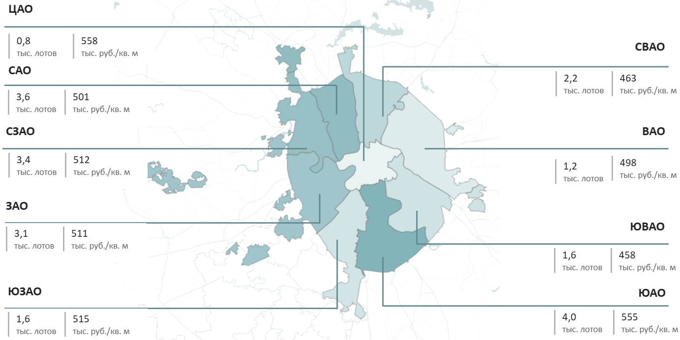 Среди округов по объему предложения лидируют ЮАО (4,0 тыс. лотов), САО (3,6 тыс. лотов) и СЗАО (3,4 тыс. лотов).