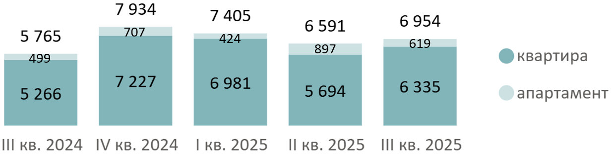 В III квартале 2025 года на рынке новостроек массового сегмента было зарегистрировано 7 тыс. ДДУ (+5,5% за квартал, +20,6% за год).