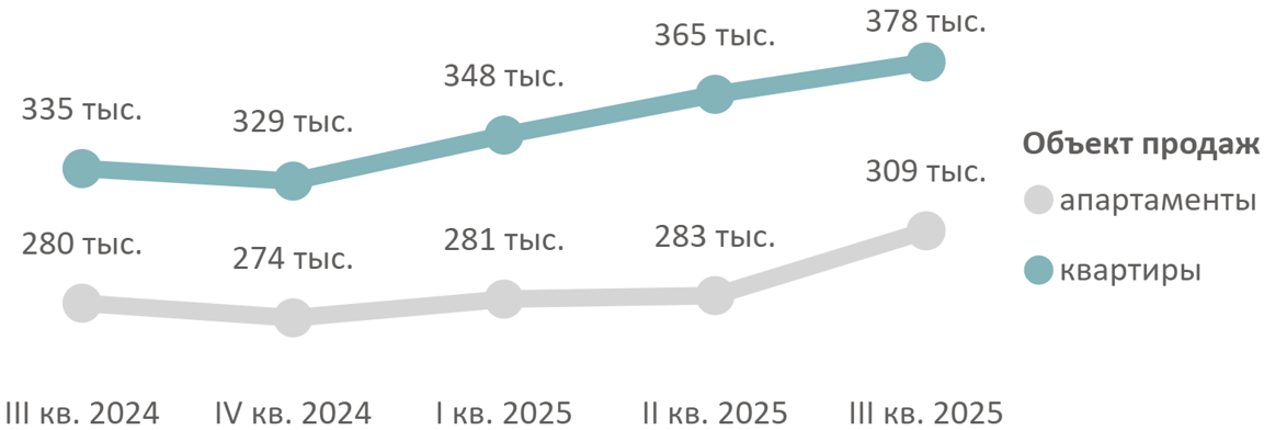 Средневзвешенная цена квадратного метра квартир и апартаментов по итогам III квартала 2025 года составила 371 760 рублей. (+4% за квартал, +13% за год). Средневзвешенная цена квартир – 377 820 руб. за кв. метр (+4% за квартал, +13% за год), апартаментов – 309 250 руб. за кв. метр (+9% за квартал, +11% за год). Такие данные «Стройгазете» предоставили аналитики компании «Метриум».