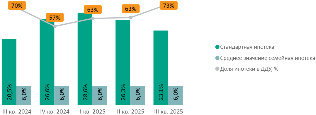 Доля сделок с привлечением ипотечного кредита в III квартале составила 73% (+10 п.п. за квартал, +3% за год). Средняя ставка по рыночной ипотеке за квартал сократилась на 3,2 п.п. до 23,1%, а к концу сентября 2025 года ставка достигла 21,7%.
