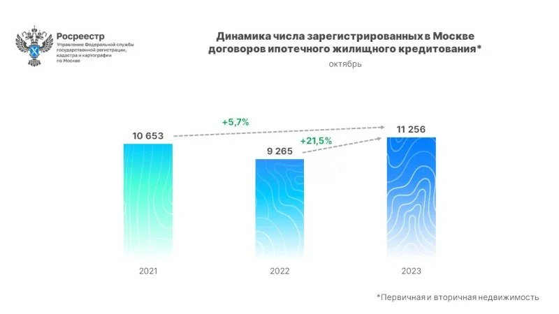 В октябре 2023 года управлением Росреестра по Москве зарегистрировано 11 256 договоров ипотечного жилищного кредитования в отношении первичной и вторичной недвижимости столицы. Об этом говорится в сообщении на сайте Росреестра. Данный показатель на 21,5% превысил результат аналогичного периода прошлого года (9 265) и на 5,7% больше сентября 2021 года (10 653).