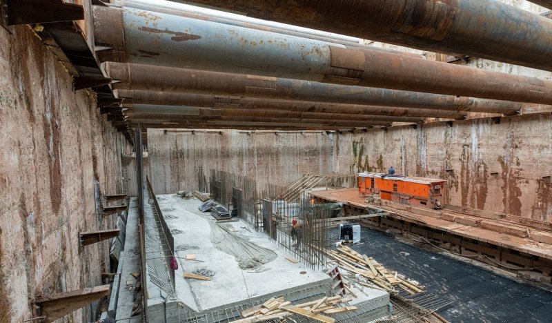 Ежедневно на строительной площадке трудятся около 350 человек. Помимо монолитных работ, они занимаются устройством гидроизоляции будущего станционного комплекса.