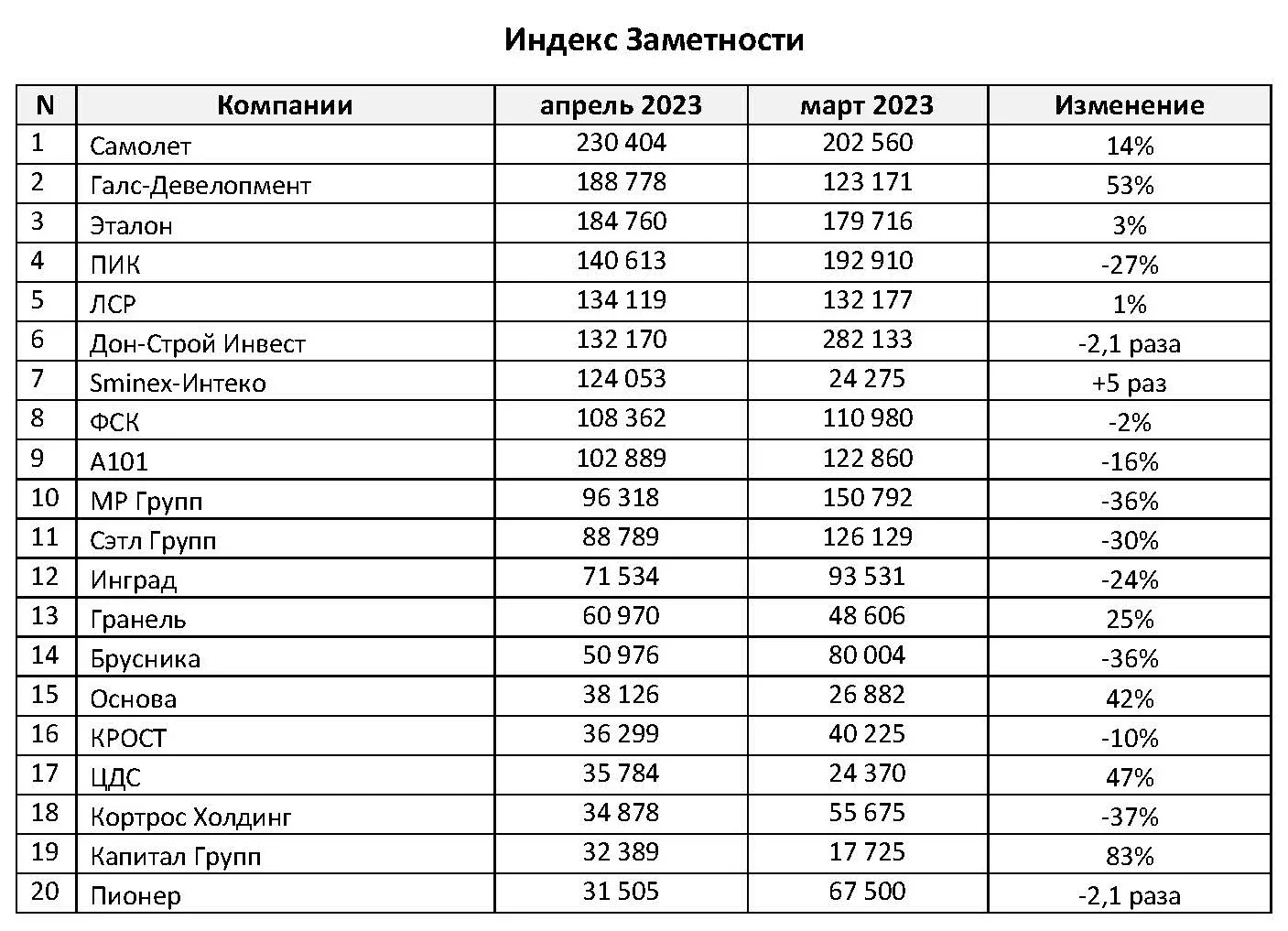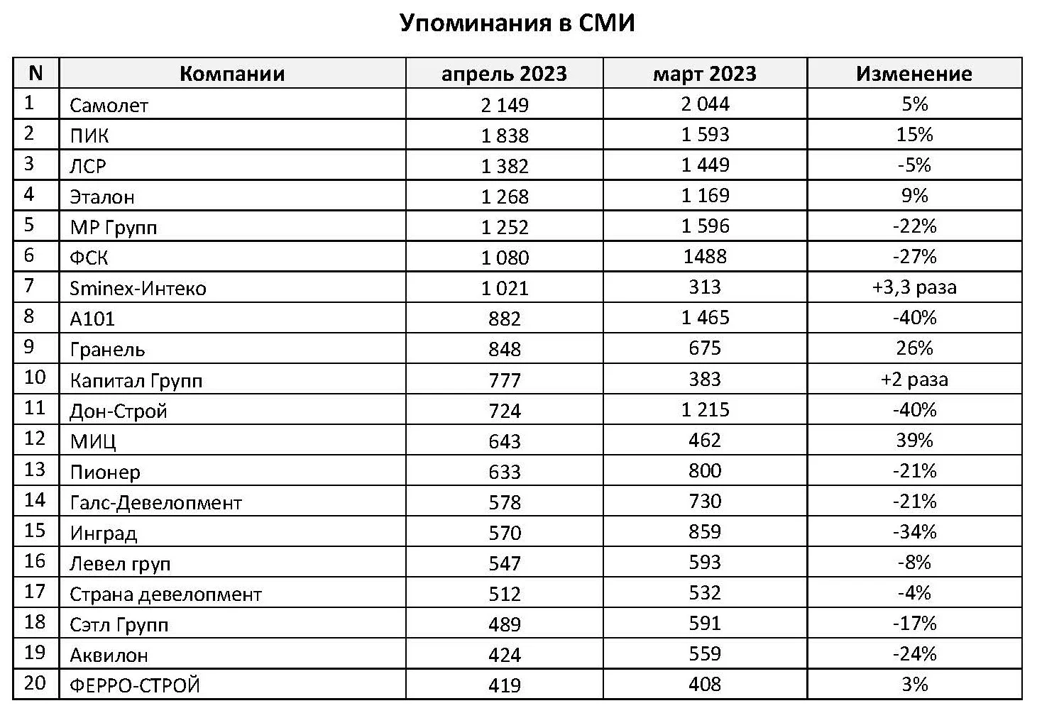Система мониторинга и анализа СМИ и соцмедиа СКАН-Интерфакс совместно со «Строительной газетой» подготовили медиарейтинг компаний девелоперов за апрель 2023 года. В топе рейтинга сохранили свое присутствие ГК «Самолет», ГК «ПИК», «Группа ЛСР» и ГК «Эталон». Кроме того, в лидеры вышел Галс Девелопмент.