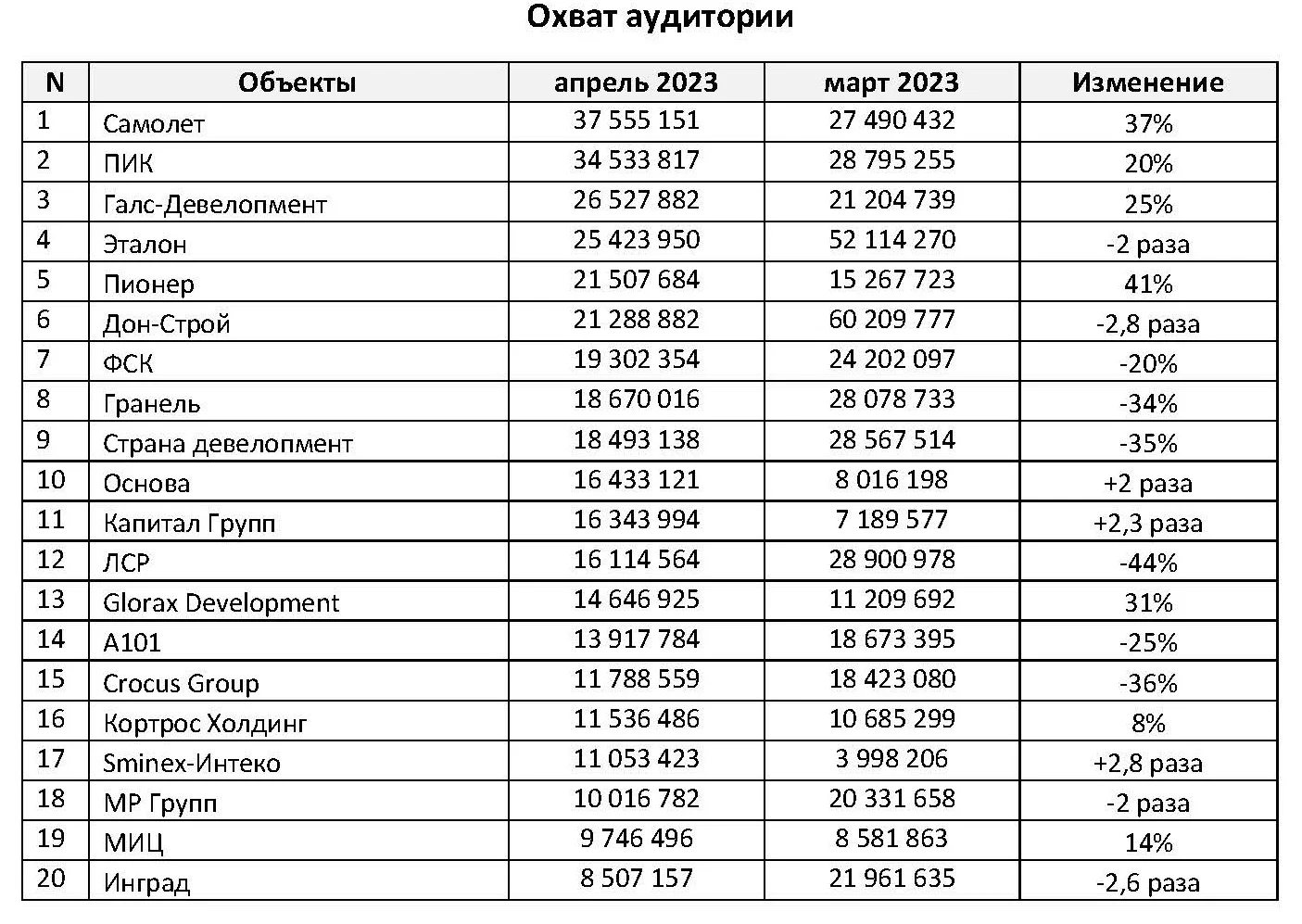 Четвертое место по охвату аудитории в апреле 2023 года заняла ГК «Эталон». Девелопер начал продажи таунхаусов в жилом квартале Shagal на юге Москвы. Там же, в квартале Shagal, «Эталон» планирует передать городу первый детсад. Группа «Эталон» завершает строительство корпусов второй очереди жилого квартала Nagatino i-Land. ГК «Эталон» завершила пилотный проект по внедрению умного голосового робота Robovoice, который должен повысить эффективность работы колл-центра компании. Другие новости месяца: совет директоров ГК «Эталон» покинул один из независимых директоров Харалампос Августи; девелопер открывает продажи в новом проекте «Счастье в Кольцово» в Новосибирской области; группа «Эталон» ввела в эксплуатацию очередной жилой корпус в квартале «Галактика».