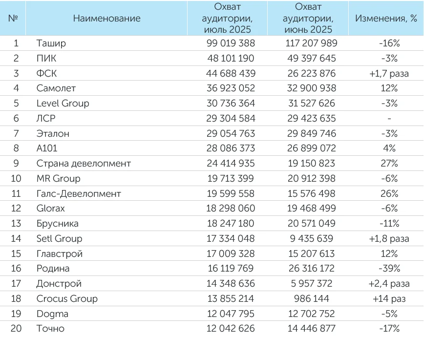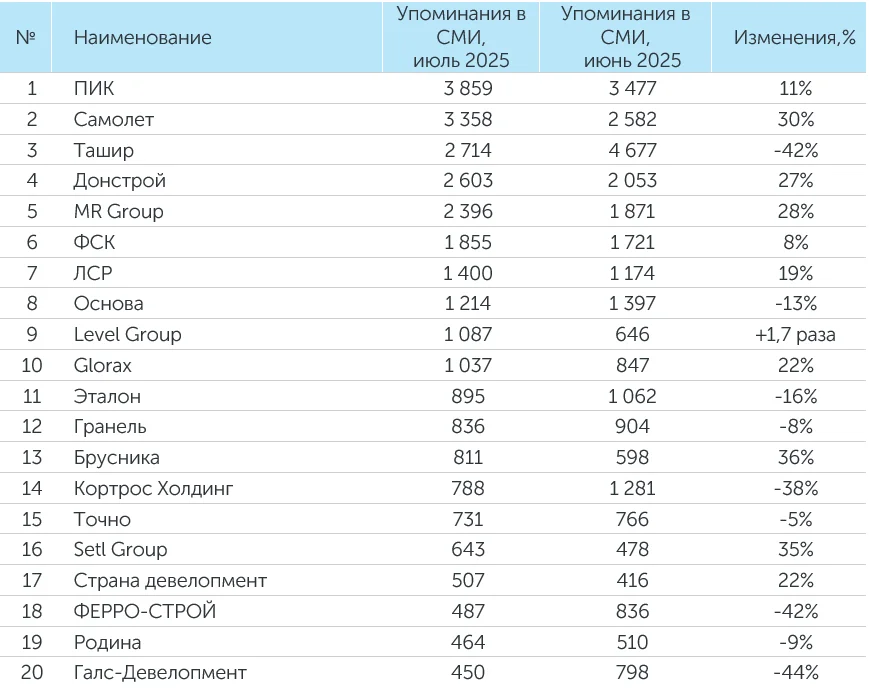 Система мониторинга и анализа СМИ и соцмедиа СКАН-Интерфакс совместно с онлайн-порталом «Строительная газета» подготовили медиарейтинг девелоперских компаний за июль 2025 года. В рейтингах девелоперов в июле 2025 года сохранили свое присутствие ГК «Ташир», ГК ПИК, ГК «Самолет» и ГК ФСК.