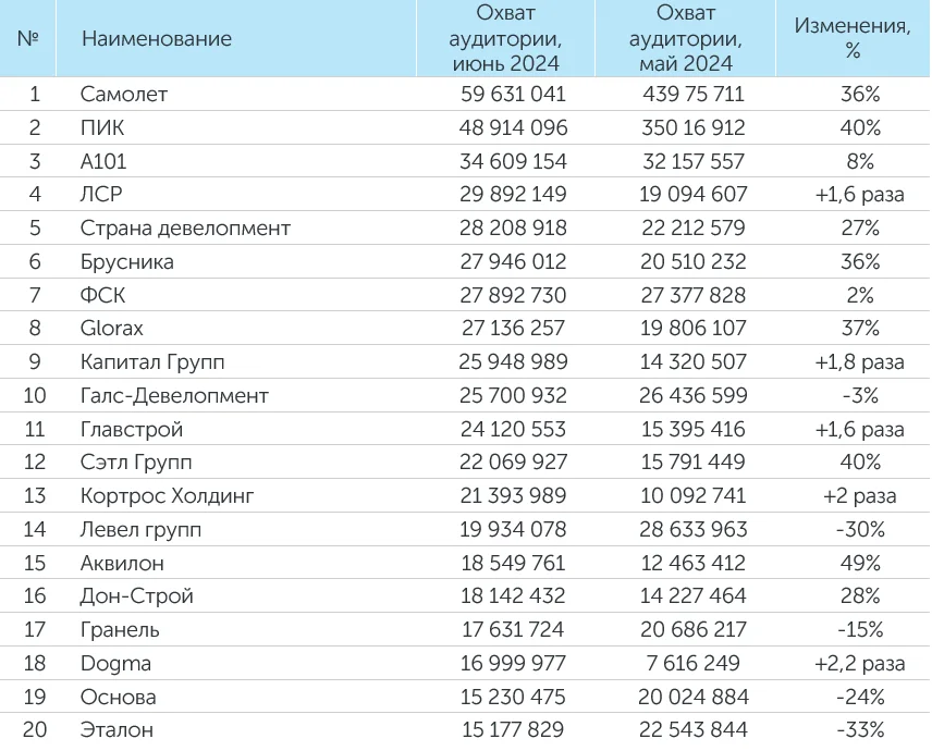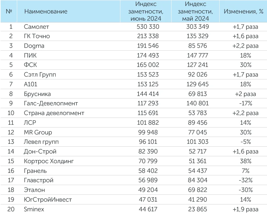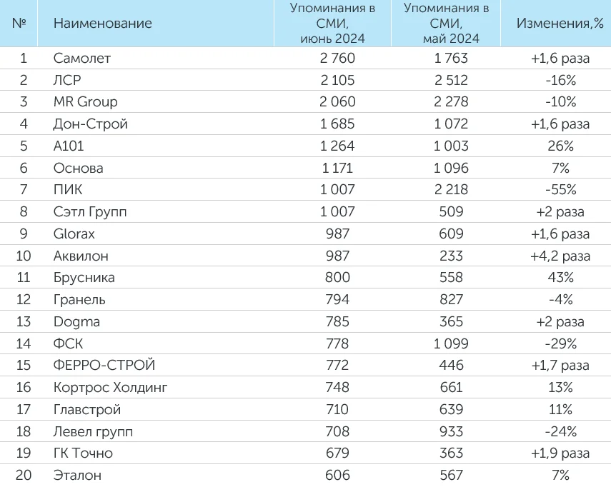 Система мониторинга и анализа СМИ и соцмедиа СКАН-Интерфакс совместно со «Строительной газетой» подготовили медиарейтинг девелоперских компаний за июнь 2024 года. В лидерах рейтинга в июне 2024 года сохранили свое присутствие ГК ПИК, ГК «Самолет», MR Group, «А 101» и «Группа ЛСР». Кроме того, в ТОП-3 вошли девелоперы Dogma и ГК ТОЧНО.