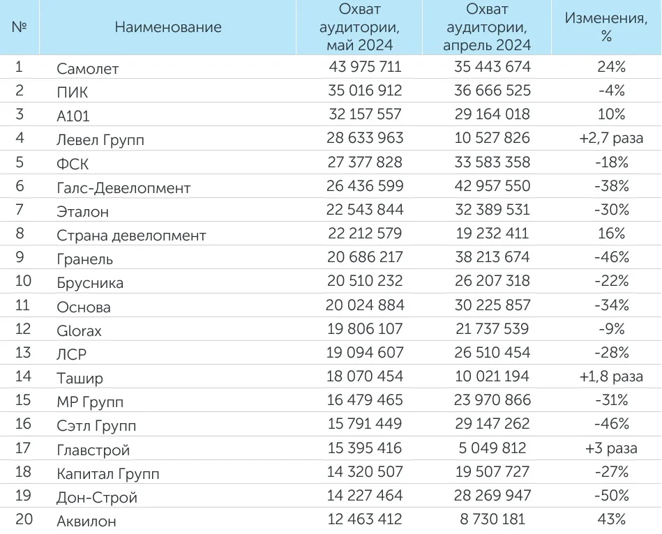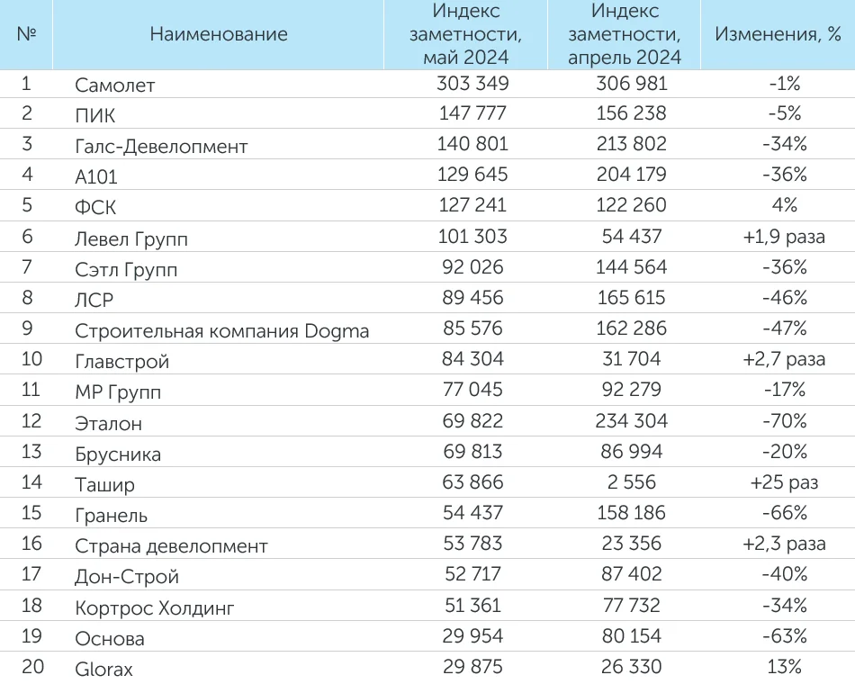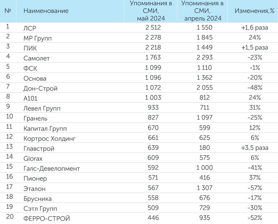 Система мониторинга и анализа СМИ и соцмедиа СКАН-Интерфакс совместно с онлайн-редакцией «Строительной газеты» подготовили медиарейтинг девелоперских компаний за май 2024 года. В топе застройщиков в мае 2024 года свое присутствие сохранили ГК ПИК, ГК «Самолет», ГК «Галс-Девелопмент» и MR Group. Кроме того, в топ-3 вошли «А 101» и «Группа ЛСР».