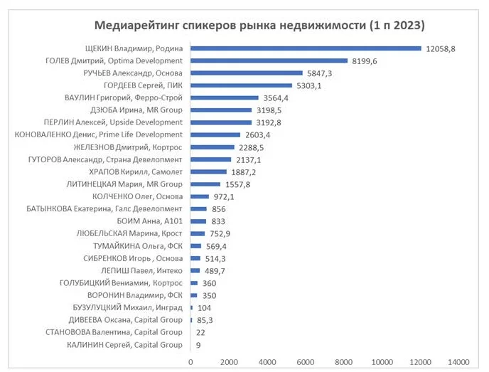 «Строительная газета» совместно с «Медиалогией» (система аналитики социальных сетей и СМИ, лидирующая на рынке по охвату источников) подготовили медиарейтинг спикеров девелоперов за первое полугодие 2023 года. Рейтинг составлялся по МедиаИндексу, который измеряет прежде всего качество контента. Лидерами рейтинга стали основатель Группы Родина Владимир Щекин, коммерческий директор Optima Development Дмитрий Голев и президент Группы Компаний «Основа» Александр Ручьев. Спикеры заметно присутствовали в информационной повестке не только за счет новостей о реализации своих проектов, но и благодаря активной профессиональной позиции, участию в обсуждении ключевых событий отрасли, анализу рыночной конъюнктуры.