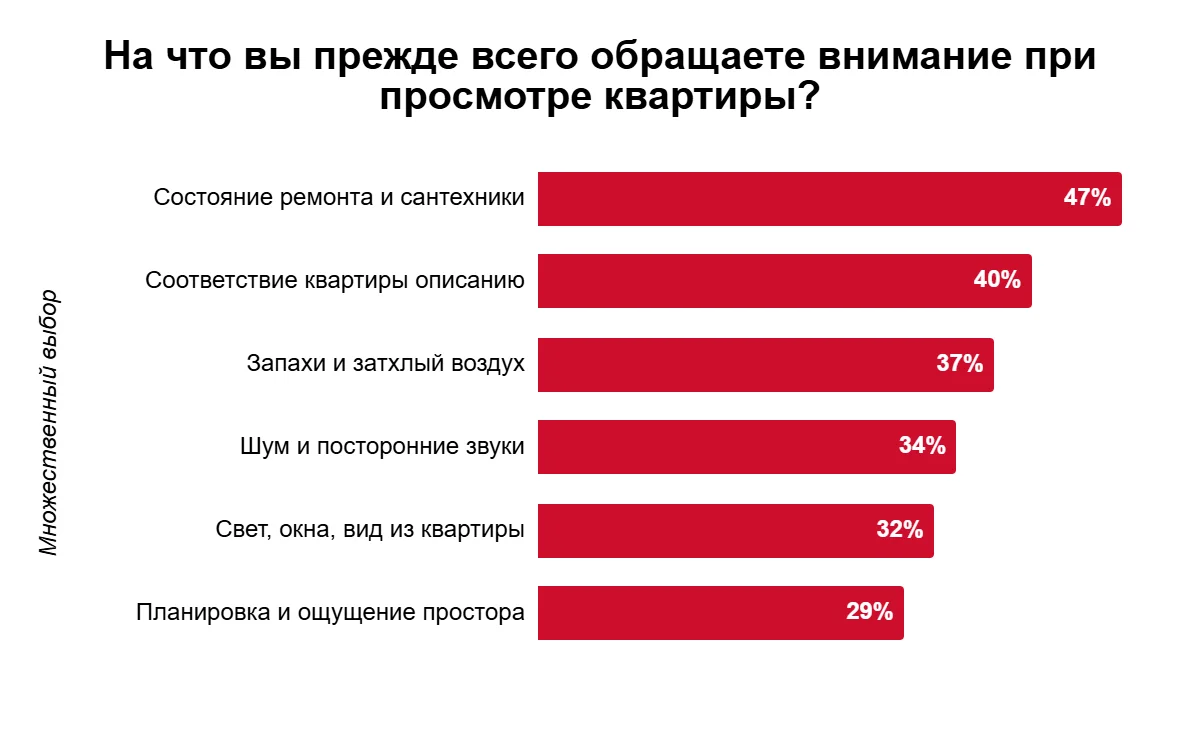 Для 32% также оказались важны освещенность и вид из окна (32%), для 29% — планировка и ощущение простора. Большая часть этих параметров относится к физическим характеристикам жилья — то есть, к тем аспектам, которые нельзя исправить декором или заменой мебели. Фактически они и формируют первое впечатление от квартиры и определяют, насколько жильем готовы заинтересоваться дальше.