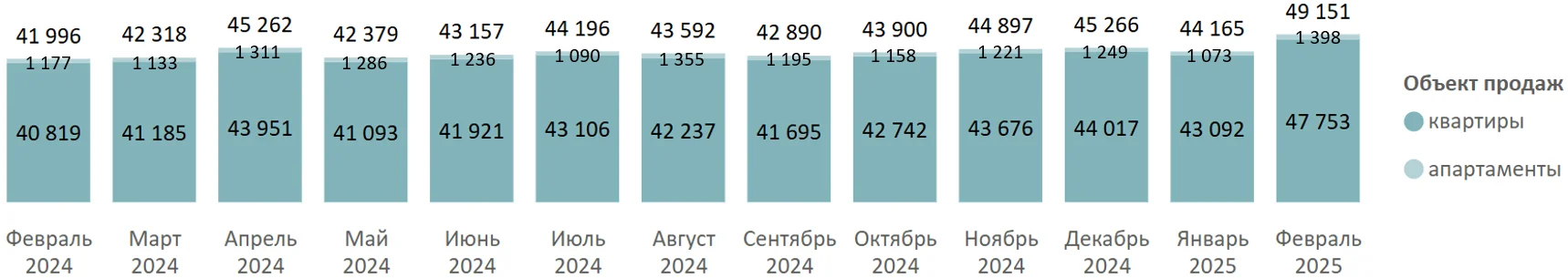 В феврале 2025 года на рынке новостроек Московской области было зарегистрировано 4,6 тыс. ДДУ (+36,7% за месяц, +66,7% за год), с апартаментами – 37 сделок, с квартирами – 4,5 тыс.