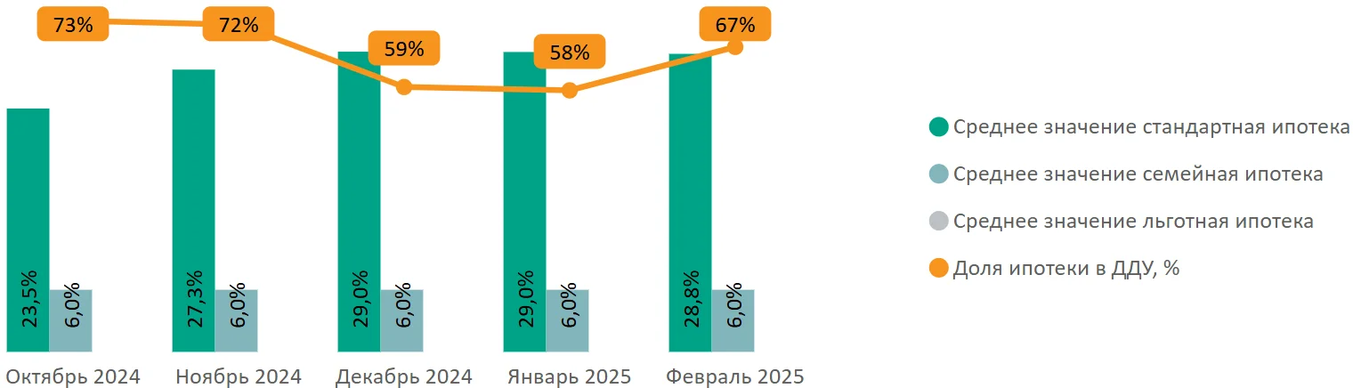 Доля сделок с привлечением ипотечного кредита к февралю выросла до 67%, относительно января 2025 года показатель вырос на 9 п.п. Средняя ставка по рыночной ипотеке в феврале составила 28,8%.