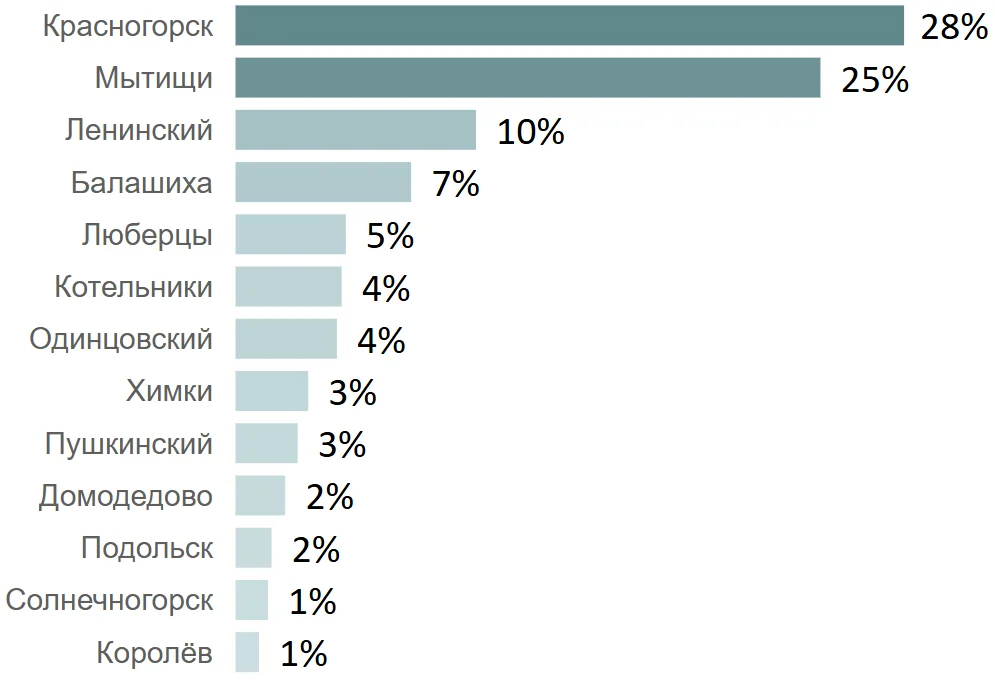 Среди округов по объему сделок в феврале лидируют Красногорск (28%), Мытищи (25%) и Ленинский г. о. (10%). По продажам в Красногорске лидируют «Ильинские луга» (834 ДДУ) и «Level Лесной» (130 ДДУ).