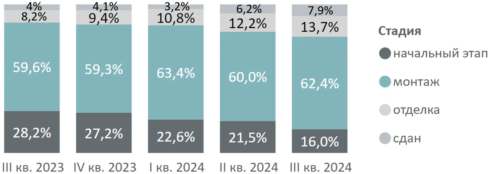 Наибольшая доля предложения находится на этапе монтажа этажей (62,4%, +2,4 п.п. за квартал). Доля предложения в корпусах на начальном этапе строительства сократилась на 5,5 п.п. и составила 16%.