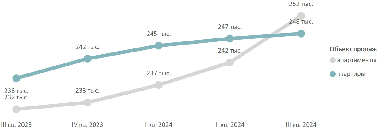 По подсчетам аналитиков «Метриум», средневзвешенная цена квадратного метра квартир и апартаментов по итогам III квартала 2024 года составила 247 900 руб. за кв. м (+0,5% за квартал, +2,4% к началу года, +4% за год). Средневзвешенная цена квартир составила 247 800 руб. за кв. м (+0,4% за квартал, +2,2% к началу года, +4% за год), апартаментов – 251 550 (+4,1% за квартал, +7,9% к началу года, +9% за год). Средняя медианная цена кв. м квартир и апартаментов по итогам III квартала выросла на 0,5% и составила 256 836 рублей.