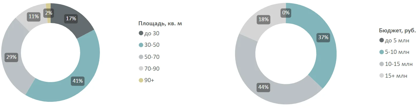Распределение предложений на первичном рынке недвижимости Новой Москвы по площадям и бюджетам