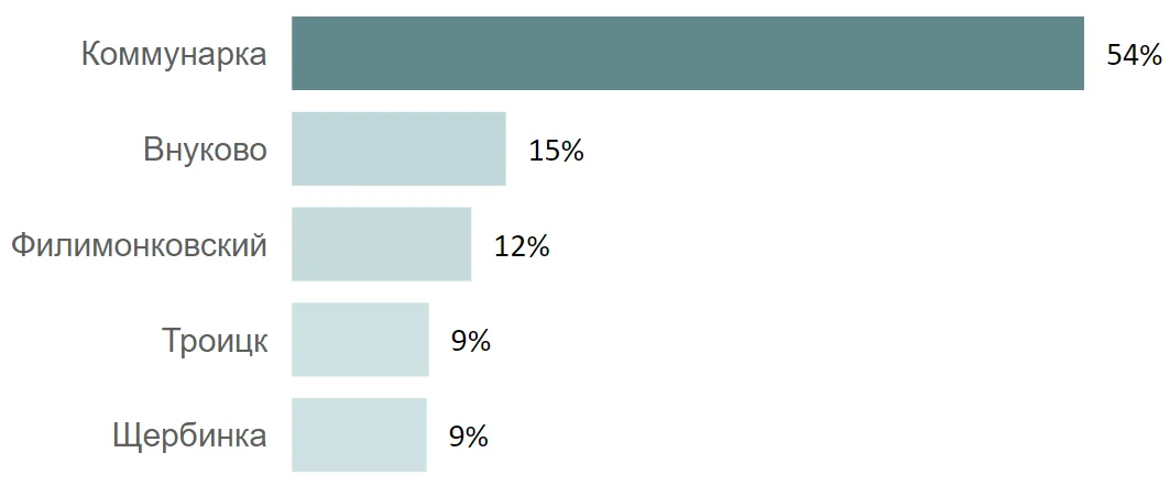В распределении спроса по новым районам Новой Москвы, что официально вступят в силу с 1 января 2025 года, наибольшая доля сделок в III квартале 2024 года была зарегистрирована в районе Коммунарка (54%, +2 п.п. за квартал).