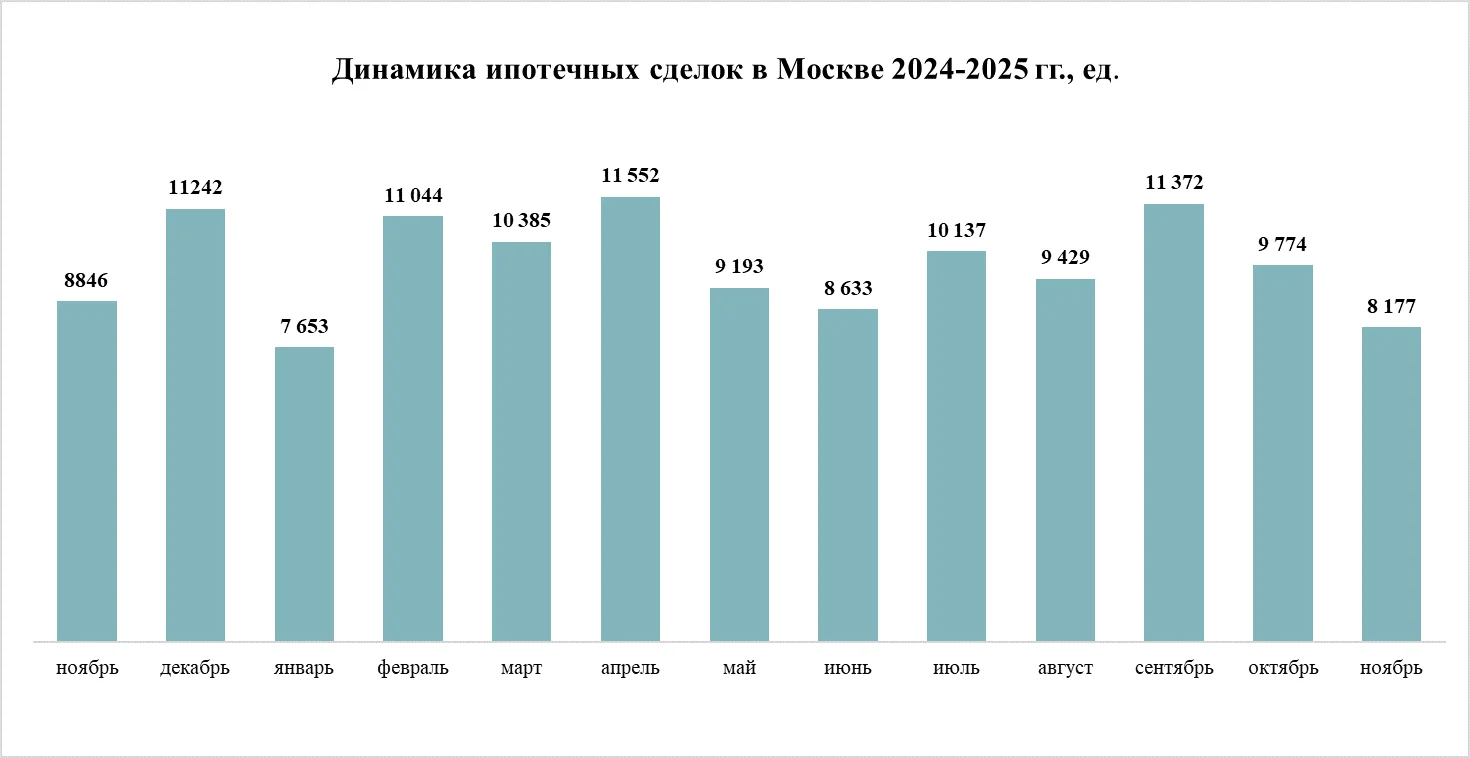 Всего за одиннадцать месяцев 2025 года в Москве было заключено 107,4 тыс. ипотечных договоров. По предварительным итогам года этот показатель уступает результатам трех из пяти последних лет. Больше сделок было зарегистрировано за аналогичный период 2024 года (109,6 тыс.), 2023 года (126,5 тыс.), 2021 года (114,1 тыс.). Текущий результат опережает показатели января-ноября 2022 года (97,4 тыс.) и 2020 года (91,2 тыс.).