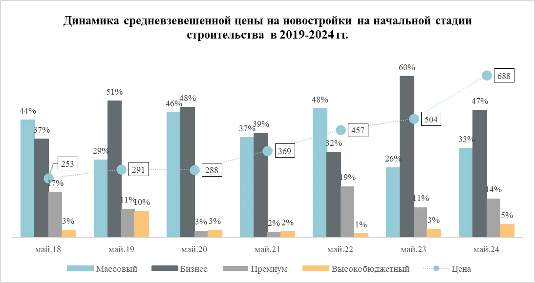 В премиальном сегменте средняя стоимость «квадрата» на начальной стадии строительства составляет 636 тыс. рублей. В среднем по сегменту квадратный метр здесь стоит 691 тыс. рублей.