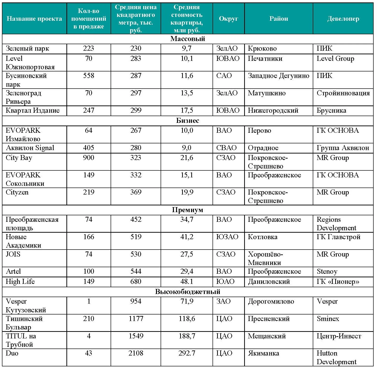 В бизнес-классе квадратный метр на начальной стадии строительства обойдется в среднем в 448 тыс. рублей. Средняя стоимость квадратного метра по всему сегменту составляет 458 тыс. рублей.