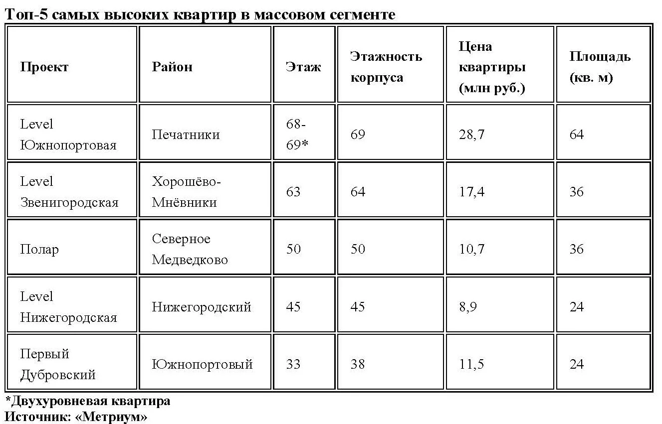 Лидером рейтинга в массовом сегменте стал проект «Level Южнопортовая», где двухуровневая квартира на 68-69 этажах 69-этажного небоскреба предлагается по цене 28,7 млн рублей. «Level Южнопортовая» – это новый жилой комплекс комфорт-класса, расположенный недалеко от набережной Москвы-реки в районе Печатники (ЮВАО), который считается ближайшим к центру города среди районов ЮВАО. В рамках проекта планируется возведение 14 корпусов высотой до 69 этажей, включающих более 6 тыс. квартир и апартаментов. Площадь квартиры на 69 этаже составляет 64 кв. метра, а стоимость квадратного метра – 451 тыс. рублей.