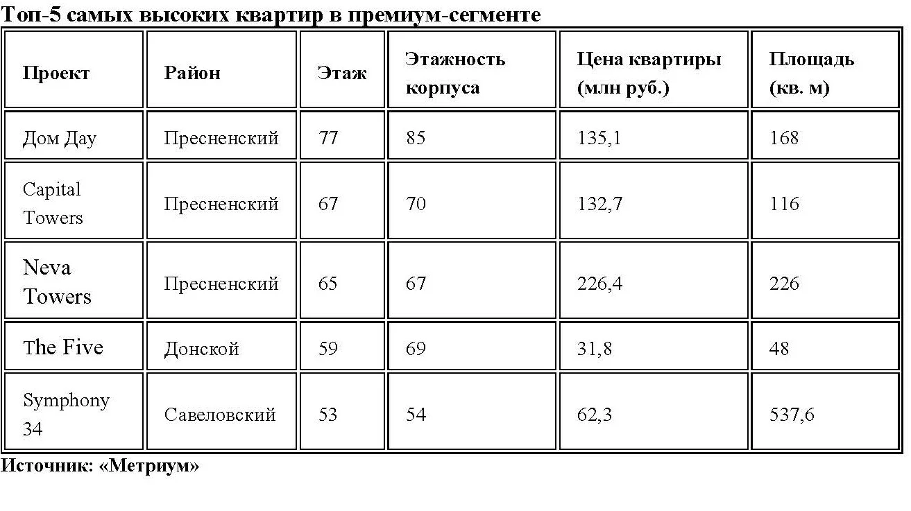В премиум-сегменте лидирует квартира на 77 этаже 85-этажного небоскреба «Дом Дау», расположенного в Пресненском районе. Стоимость этой четырехкомнатной квартиры составляет 135,1 млн рублей. «Дом Дау» – это высотный жилой комплекс, удачно интегрированный в деловой кластер «Москва-Сити», но при этом расположенный около парка. Из окон открываются панорамные виды на город и близлежащий парк. «Дом Дау» полностью соответствует высоким требованиям премиум-класса и превосходит ожидания самых взыскательных покупателей. Автор архитектурной концепции – именитое бюро СПИЧ. Небоскреб включает квартиры, четырехуровневый подземный паркинг и трехэтажный стилобат. На кровле стилобата откроется приватный внутренний двор с собственным садом, доступным только для резидентов. С другой стороны башни, на том же уровне, будут оборудованы детская площадка, уличный кинотеатр, зона для йоги и workout. Площадь квартиры на 77 этаже составляет 168 кв. метров, а стоимость квадратного метра – 806,7 тыс. рублей.