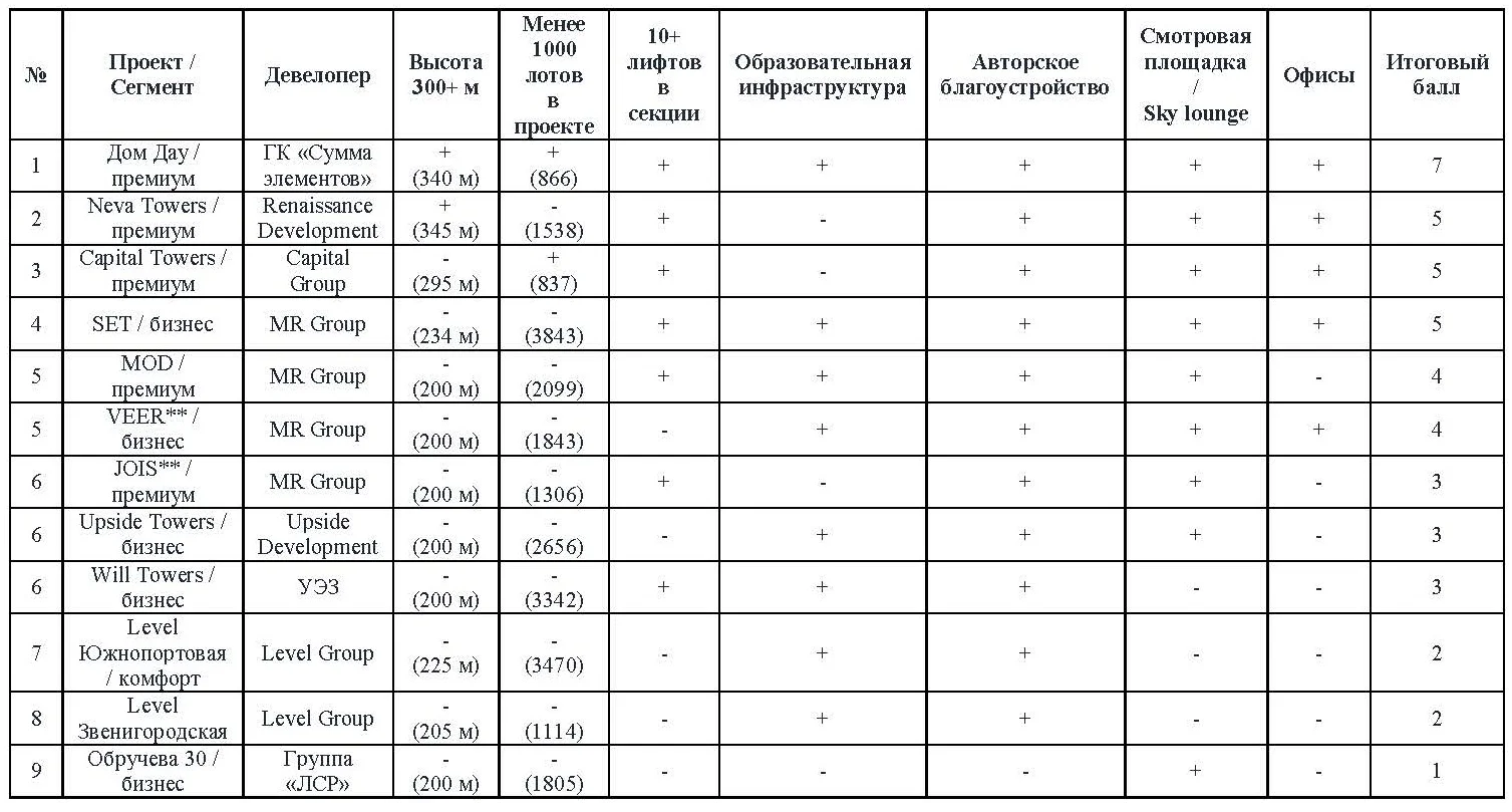 Дополнительный балл присуждался новостройкам с корпусами высотой от 300 метров. В случае равенства показателей проекты были распределены по высоте.