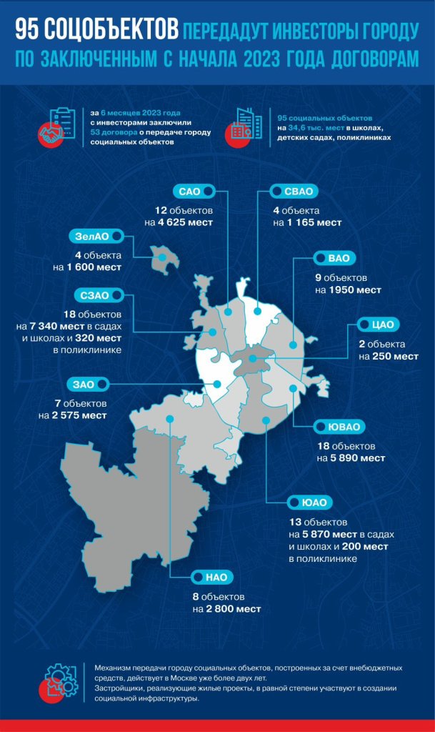 Подписанные за шесть месяцев текущего года документы подтверждают, что за счет средств инвесторов будут построены и переданы городу 52 детских сада, 41 школа и 2 поликлиники. Таким образом, бесплатными местами в детских садах будут обеспечены более 10 тыс. малышей, а новые муниципальные школы смогут принять почти 24 тыс. учеников. Помимо этого, горожанам будет доступна также медицинская помощь в двух поликлиниках, рассчитанных на 520 посещений в смену.