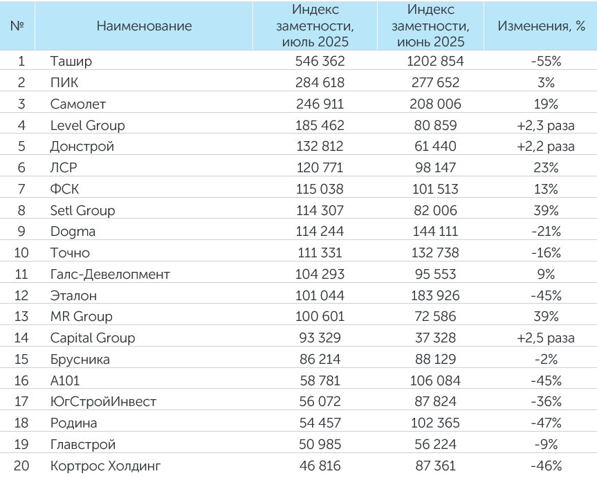 ГК «Самолет» в июле 2025 года заняла второе место по количеству упоминаний, третье место по индексу заметности.