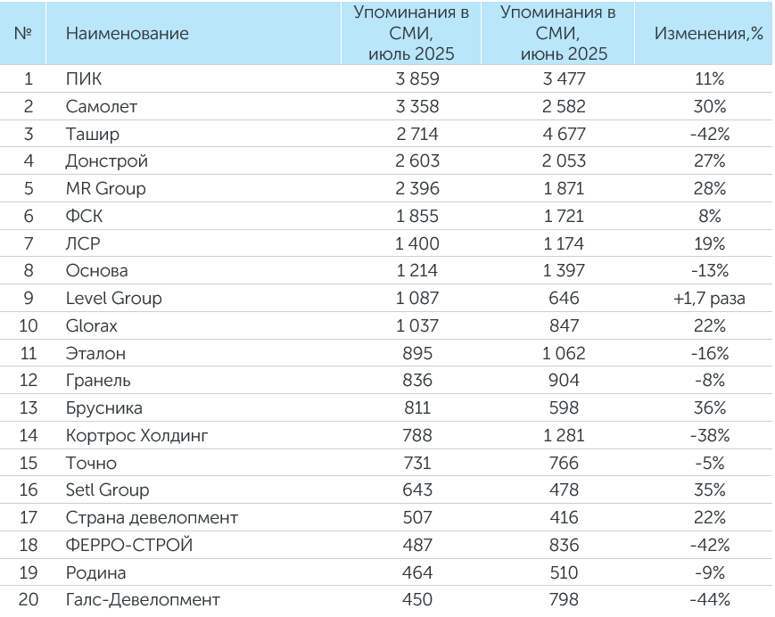 Система мониторинга и анализа СМИ и соцмедиа СКАН-Интерфакс совместно с онлайн-порталом «Строительная газета» подготовили медиарейтинг девелоперских компаний за июль 2025 года. В рейтингах девелоперов в июле 2025 года сохранили свое присутствие ГК «Ташир», ГК ПИК, ГК «Самолет» и ГК ФСК.