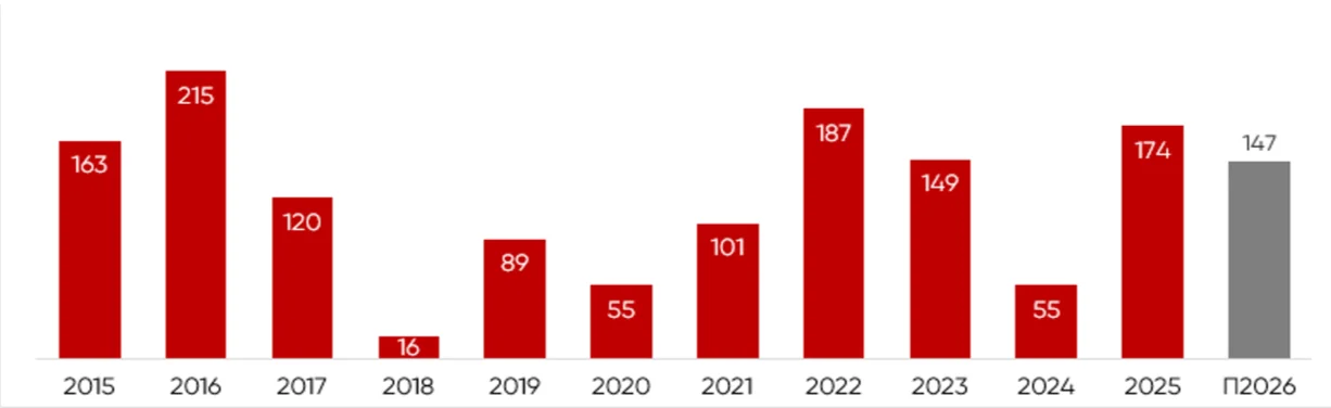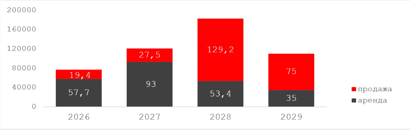 По данным на конец 2025 года объем предложения в горизонте 2026 – 2029 гг. составляет чуть более 490 тыс. кв. метров, из которых в продажу заявлено 251 тыс. кв. метров, в аренду – 239 тыс. кв. метров.