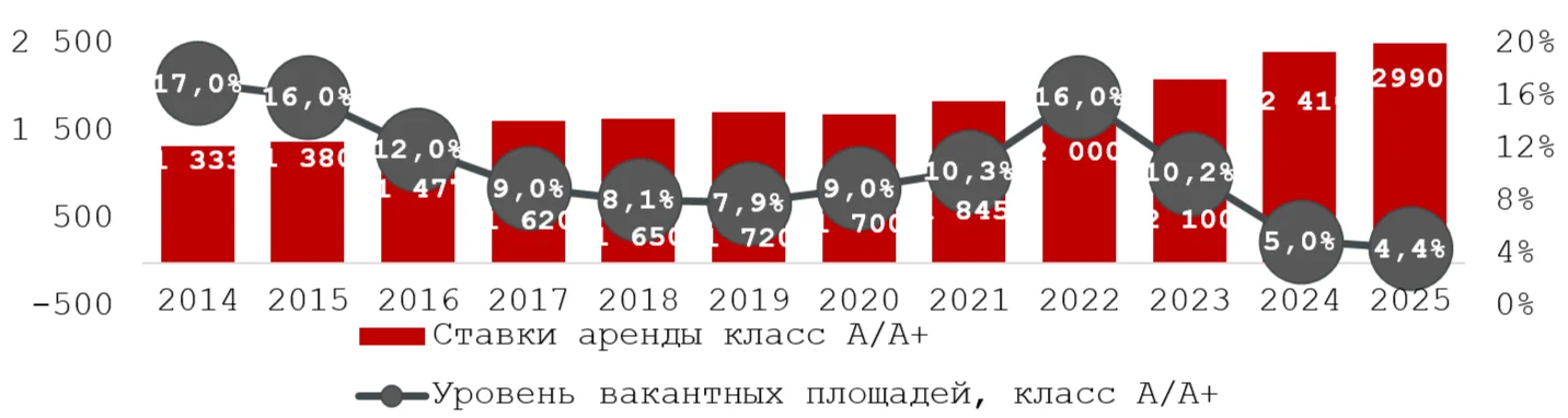 Арендные ставки на офисную недвижимость демонстрируют уверенный рост. В классе А/А+ средняя ставка с начала года увеличилась на 24%, до 2 990 рублей за кв. метр в месяц, в классе B/В+ — на 10%, до 1 983 рублей за кв. метр в месяц (включая НДС и операционные расходы).