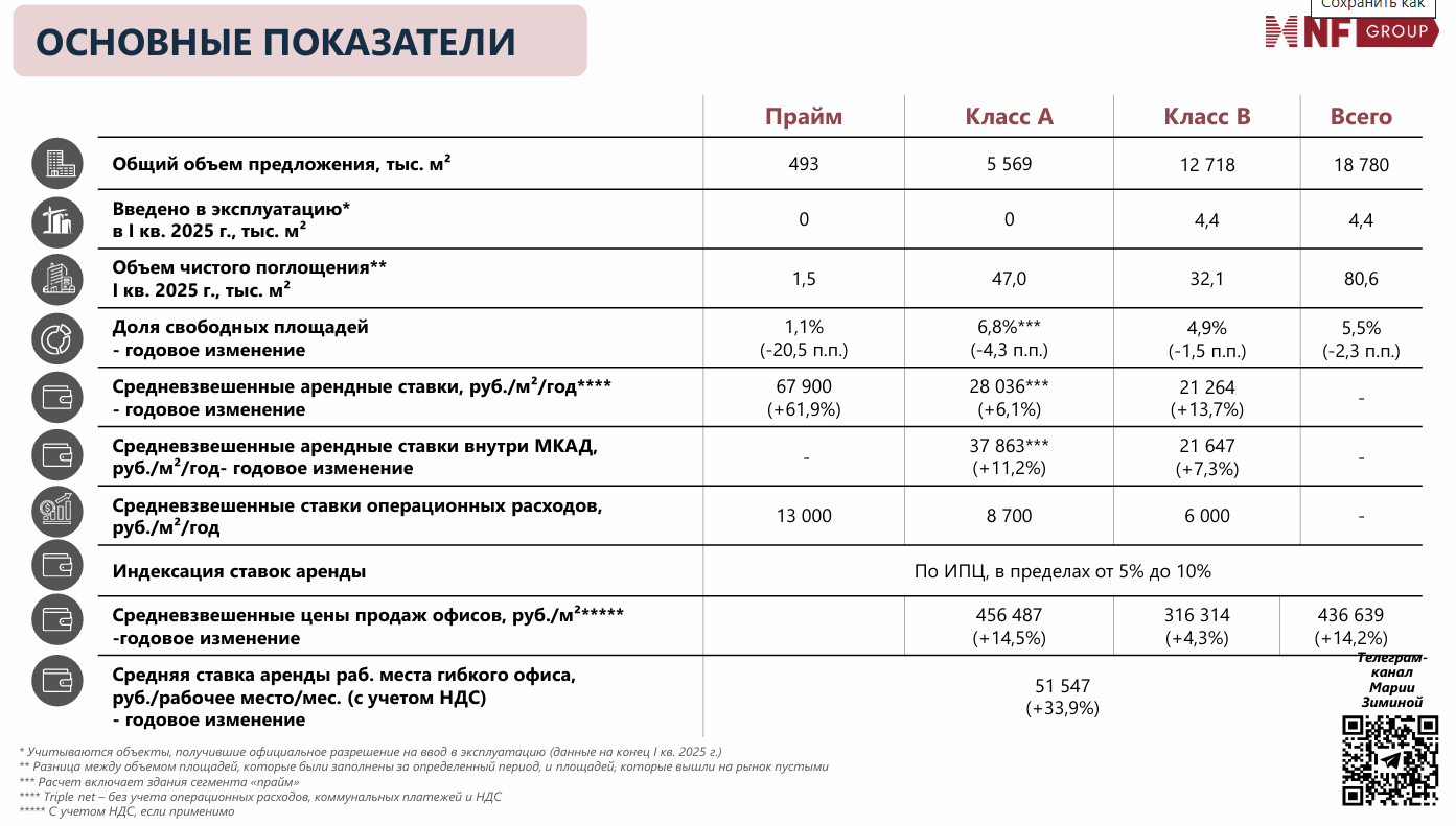 По ее словам, общий объем предложения на ранке составляет 18 780 тыс. кв. метров. Однако в I кв. 2025 г в Москве не было введено ни одного офиса класса «Прайм» и класса «А» , а офисных помещений класса «В» всего 4,4 тыс. кв. метров.