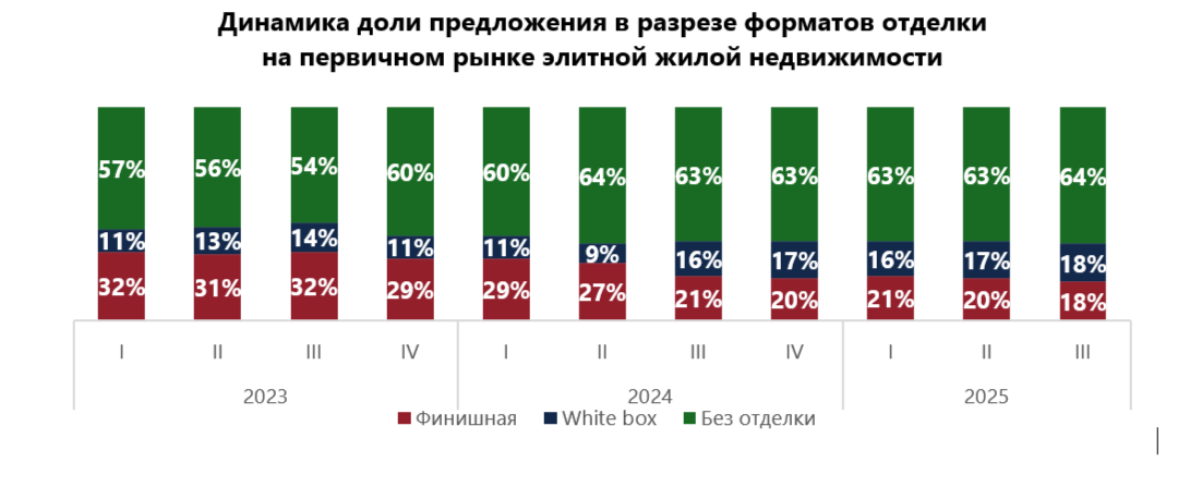 Эксперты оценили, как изменилось соотношение различных форматов отделки на рынке элитных новостроек, включая сегменты премиум и де-люкс. По итогам третьего квартала 2025 года доля предложения без отделки составила 64%, тогда как в аналогичный период 2023 года показатель находился на уровне 54%. White box (предчистовые работы) за два года вырос с 14 до 18%, а доля финишной отделки, напротив, снизилась с 32 до 18%.