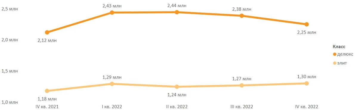 Анна Раджабова напомнила, что цена квадратного метра к концу 2022 года достигла 1,31 млн рублей в элитном классе (+11% за год) и 2,25 млн рублей в делюкс-классе (+6,1%). Средневзвешенная цена в течение года колебалась из-за нестабильности валютного курса, выхода новых проектов и точечного удорожания.