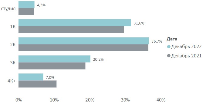 Среди предложений премиум-класса в разрезе комнатности значительную долю занимают двухкомнатные варианты (36,7%, +0,2 п.п.). В течение года уменьшалось количество многокомнатных лотов, на конец декабря 2022 года их доля составила 7% (-3,7 п.п. за год).