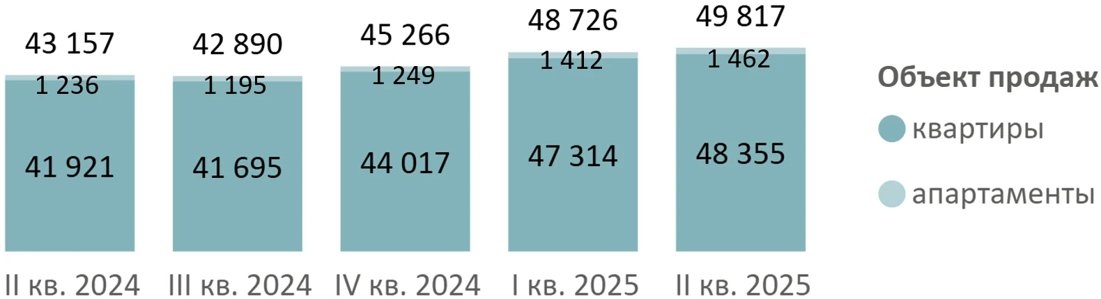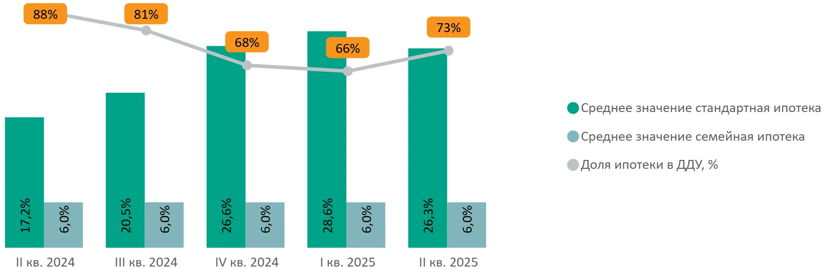Доля сделок с ипотекой в I квартале составила 66%, во втором квартале выросла до 73% (+7 п.п. за квартал).