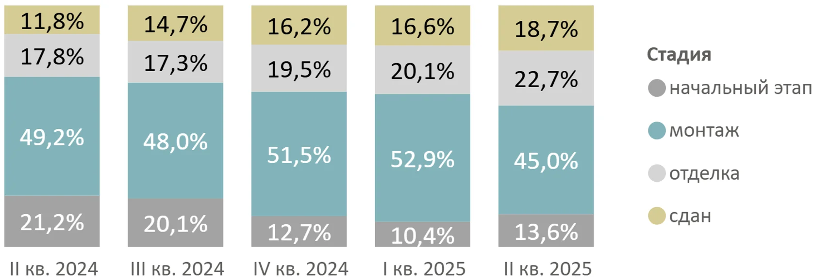 За полугодие не было отмечено значительных изменений в структуре предложения по стадиями строительной готовности, однако в годовом сопоставлении наблюдается тенденция к сокращению доли предложения на начальном этапе строительства (13,6%, -7,6 п.п. за год) на фоне замедления темпов вывода на рынок новых проектов.