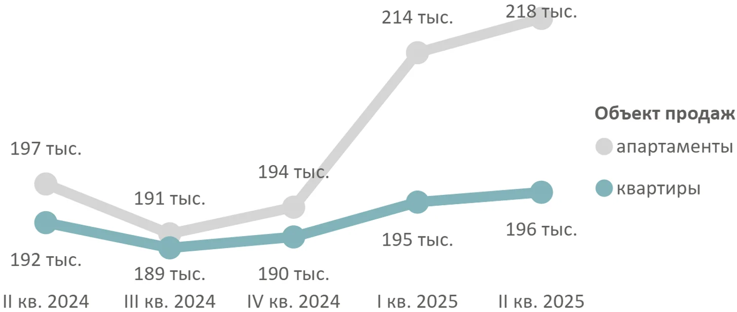 По подсчетам аналитиков «Метриум», средневзвешенная цена квадратного метра квартир и апартаментов в Московской области по итогам I полугодия 2025 года составила 196 580 руб. (+0,7% за квартал, +3,2% за полугодие, +2,2% за год). Средневзвешенная цена квартир – 196 080 руб. за кв. м (+3,0% за полугодие, +2,0% за год), апартаментов – 218 090 руб. за кв. м (+12,3% за полугодие, +10,6% за год).