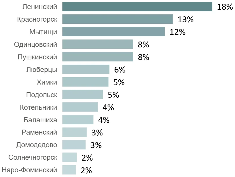 Среди округов по объему сделок в январе лидируют Ленинский г. о. (18%, +2 п.п. за мес.), Красногорск (13%, +1 п.п.) и Мытищи (12%, +1 п.п.). Среди проектов по объему зарегистрированных сделок в сегменте лидируют «Пригород Лесное» (178 ДДУ), «Яуза Парк» (152 ДДУ) и «Дубровицы Клаб» (107 ДДУ).