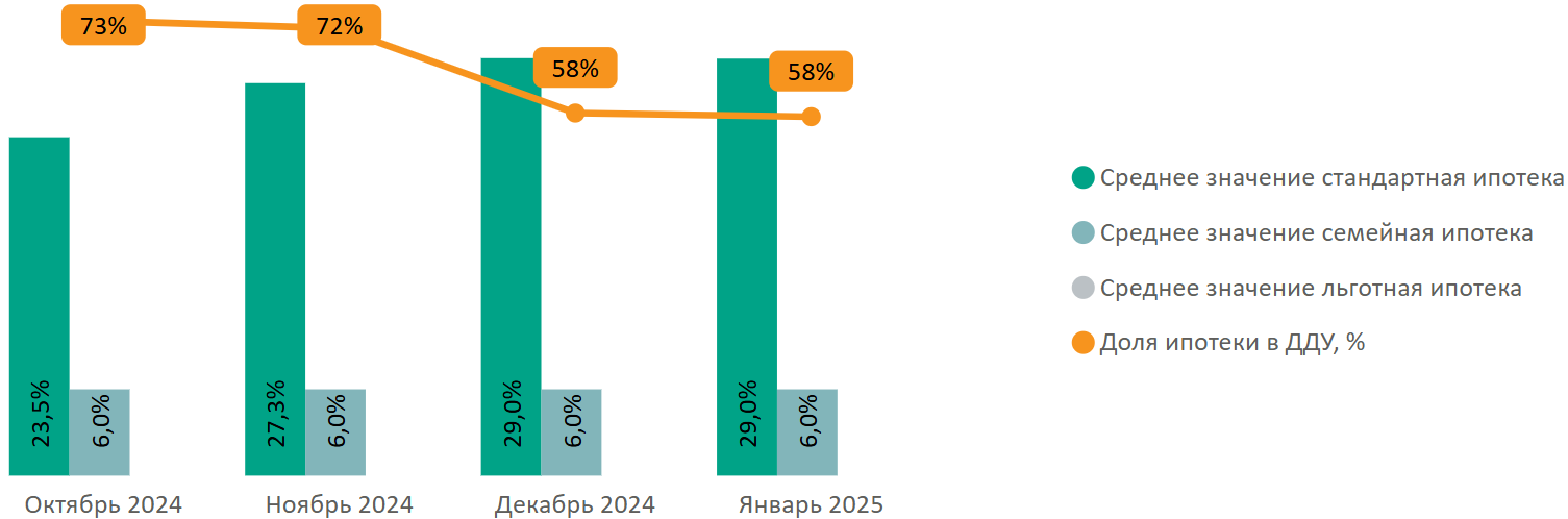 Доля сделок с привлечением ипотечного кредита в январе сохранилась на 58%, относительно ноября 2024 года показатель снизился на 14 п.п. Средняя ставка по рыночной ипотеке в январе составляет 29%.