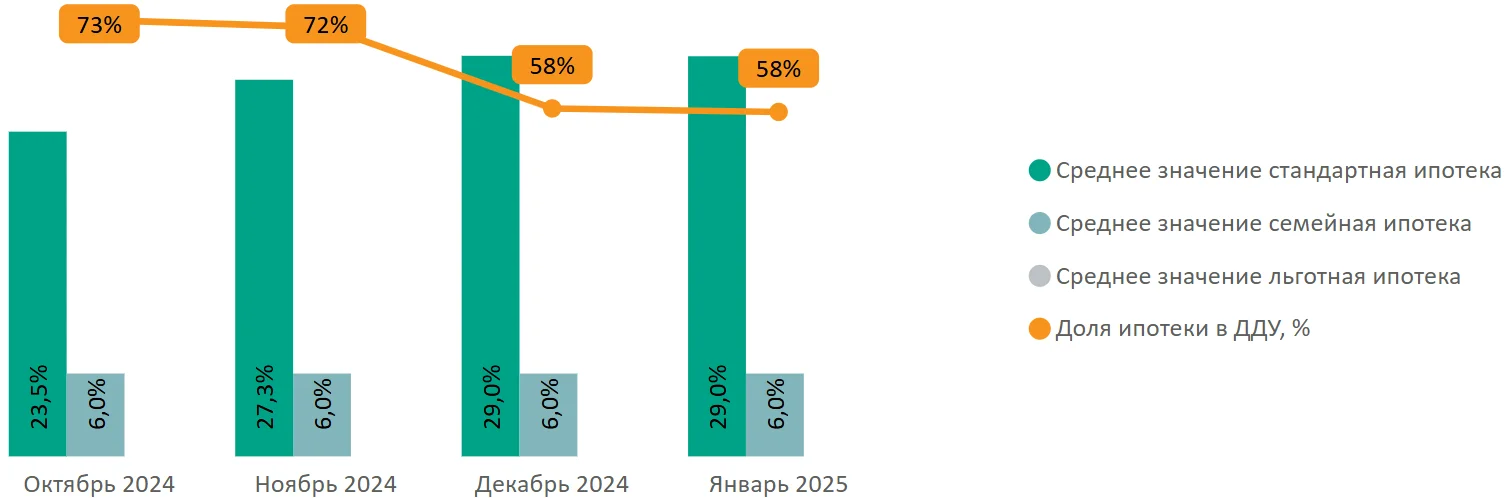 Доля сделок с привлечением ипотечного кредита в январе сохранилась на 58%, относительно ноября 2024 года показатель снизился на 14 п.п. Средняя ставка по рыночной ипотеке в январе составляет 29%.