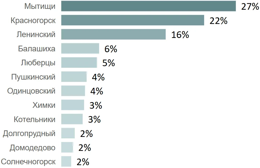Распределение сделок по ДДУ на первичном рынке недвижимости Московской области по округам с максимальной долей спроса