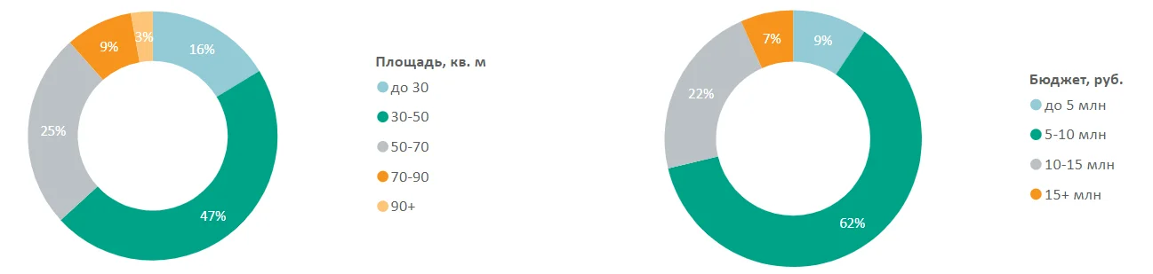 Распределение предложений на первичном рынке недвижимости Московской области по площадям и бюджетам, количество лотов