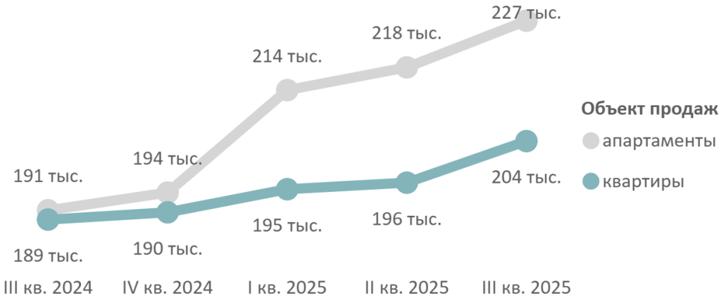 Эксперты компании «Метриум» отметили, что средневзвешенная цена квадратного метра квартир и апартаментов по итогам III квартала 2025 года составила 204,6 тыс. рублей (+4% за квартал, +8% за год). Средневзвешенная цена квартир - 204 тыс. рублей за кв. метр (+4% за квартал, +8% за год), апартаментов - 227 тыс. рублей за кв. метр (+4% за квартал, +19% за год).