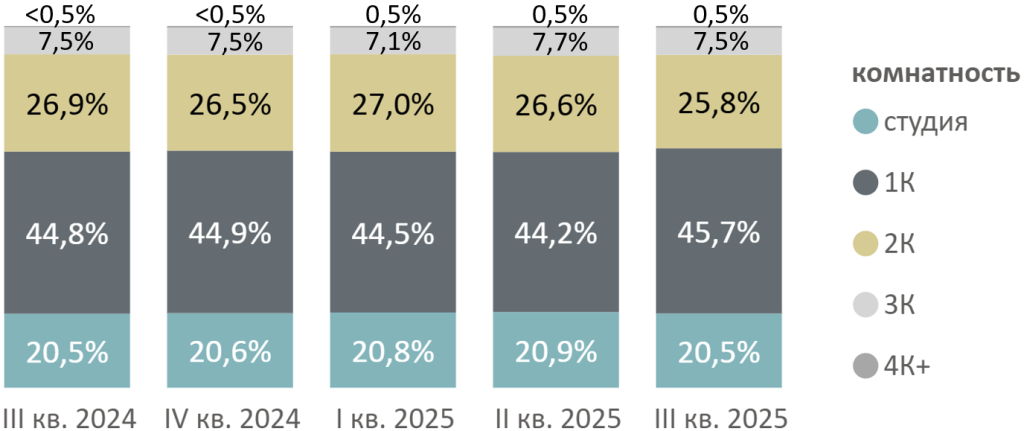 В распределении предложения по типологии отмечается рост доли однушек (45,7%, +1,5 п.п. за квартал) при сокращении доли студий (20,5%, -0,4 п.п.), двухкомнатных (25,8%, -0,8 п.п.) и трехкомнатных (7,5%, -0,2 п.п.) форматов.