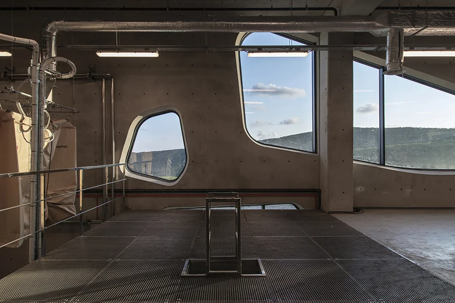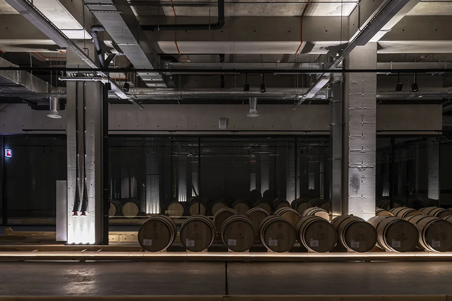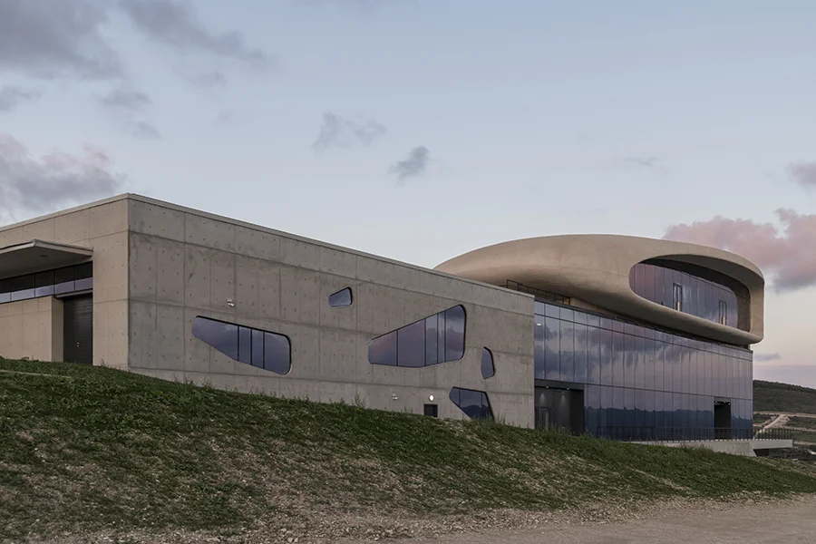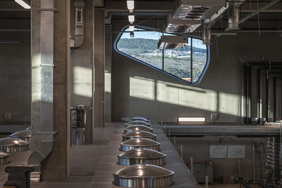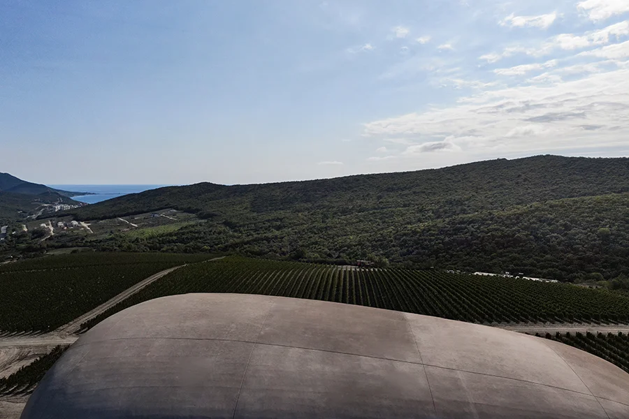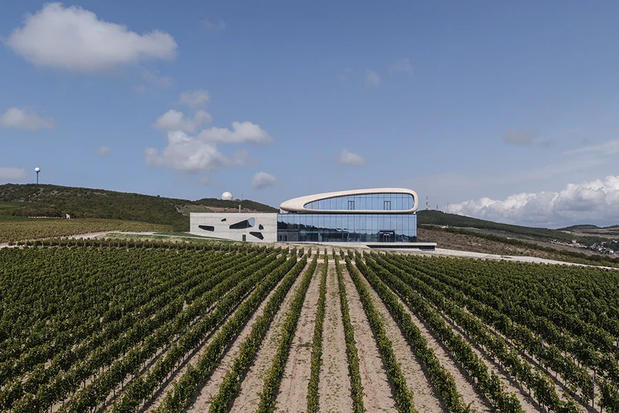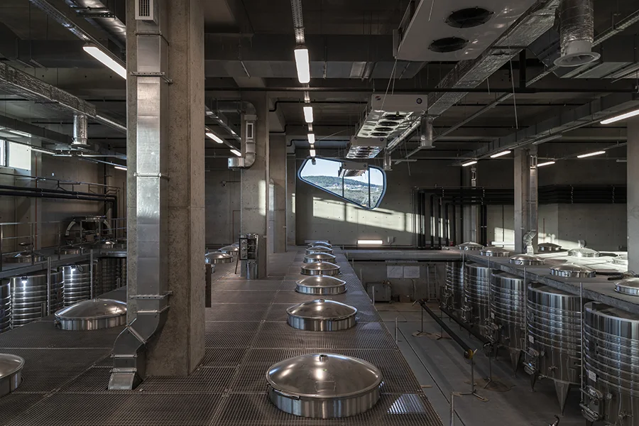 Здание винодельни площадью почти 9,8 тыс. «квадратов» состоит из двух дополняющих друг друга объемов. Бионическая форма, в которой находятся общественные зоны, расположена на строгом железобетонном параллелепипеде, где размещено оборудование для гравитационного виноделия, исключающего механическую перекачку: все перемещения вина происходят свободно под действием силы тяжести. Для такого производства необходима организация уклона в помещении и высокие потолки. Особенности технологии были учтены при проектировании нижнего, производственного уровня винодельни — он «вписан» в холмистый ландшафт и углубляется в землю, где находятся погреба для хранения бочек с вином.
