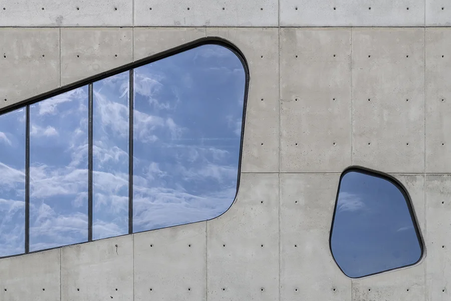 Винодельня построена из бетона. По аналогии с галькой, которая меняет цвет, контактируя то с водой, то с солнцем, этот материал имеет оттенок от почти белоснежного до темно-серого в зависимости от освещения и погоды, за счет чего визуально винодельня в разных условиях воспринимаемся по-разному.