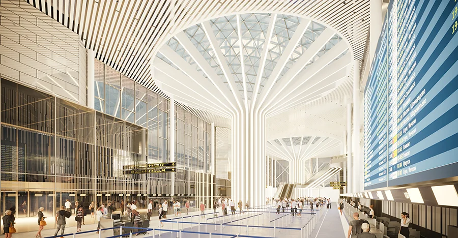 Особенностью нового терминала станет его высота — более 30 м. Здание будет иметь полностью остекленный фасад. Витражи изготовят из стекла с низким коэффициентом отражения, что позволит размыть границы между внутренним пространством и улицей. Композиционной доминантой интерьера главного холла станут многогранные белые колонны из алюминия, причудливо расширяющиеся ближе к кровле и формирующие вместе с ней прозрачные атриумы. Их внешний облик кому-то напомнит турбины самолета, а кому-то фантастические деревья.