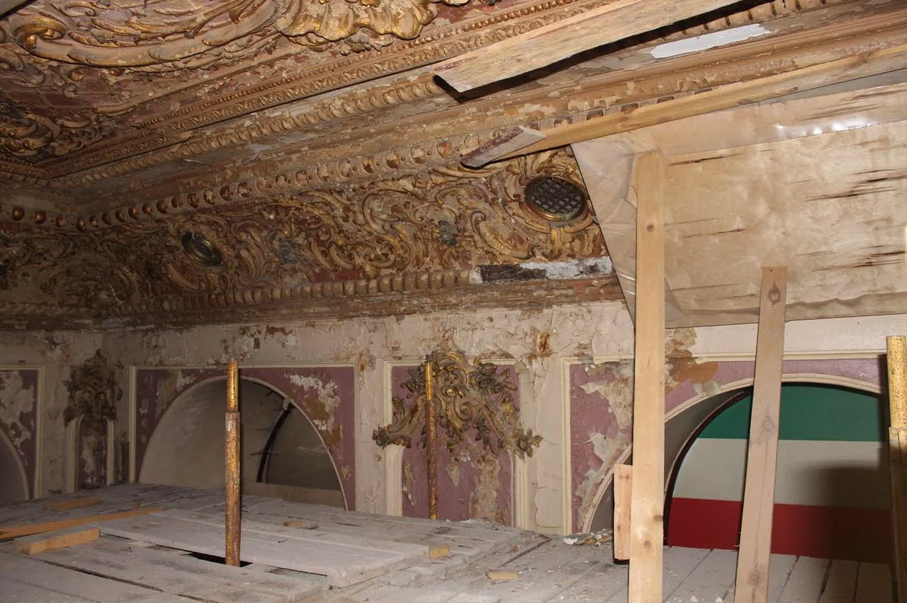 Потолки с богатым лепным декором за многие годы тоже сильно пострадали. Сейчас, несмотря на их аварийное состояние, специалисты исследуют все, что на них сохранилось для последующей реставрации. Помимо прочего, в отделке стен вестибюля здания был найден красный и белый мрамор, относящийся к середине прошлого столетия, а также обнаружены хорошо сохранившаяся гипсовая капитель и несколько видов росписи на живописном плафоне. Все это также готовится к демонтажу, так как почти все стены, к которым крепили декоративные элементы, требуют срочного восстановления.