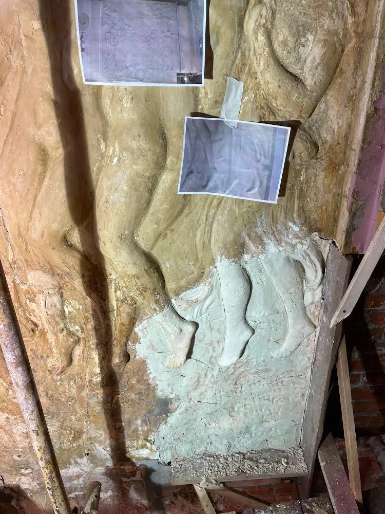 Помимо этого специалисты изучили и укрепили также и обнаруженные барельефы. Дело в том, что стена, на которой они закреплены, находится в аварийном состоянии, поэтому в будущем элементы декора также будут демонтированы и перевезены в мастерские для последующих работ по их сохранению.